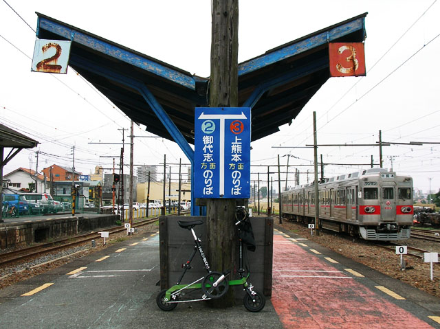 自転車を引いて6000系に乗り込み、 次駅「黒髪町」で下車。 黒髪町〜藤崎宮前間には 車道と併走する併用軌道区間が ほんの数百メートルですが存在します。