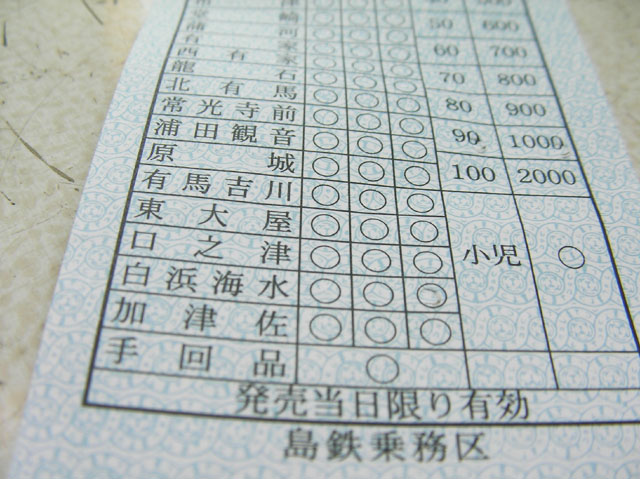車内で購入した切符は 駅のリストが印刷された紙に パンチで穴を開ける簡素なもの。 私の地元を走っていた福井鉄道南越線でも このような切符があったなぁ・・・としみじみ。